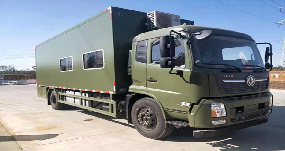 东风天锦底盘、加装副车架、封闭式箱体、12个上下铺(可居住20-24人)、环境系统(置顶空调、排气扇、采光窗户及窗帘、环境报**)、水箱(含净水箱、污水箱)、卫生间及淋浴系统(热水器、蹲式打包厕所、洗漱平台、上下水系统)、逆变器、卫星天线接收器、吸顶电视等。
